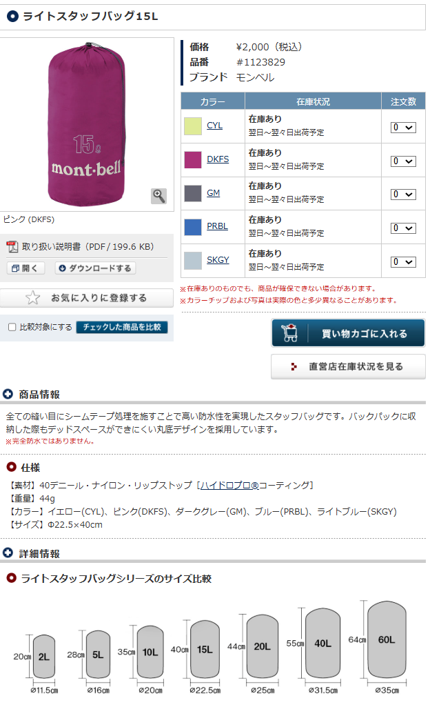ライトスタッフバッグ(モンベル)15Lの場合・・