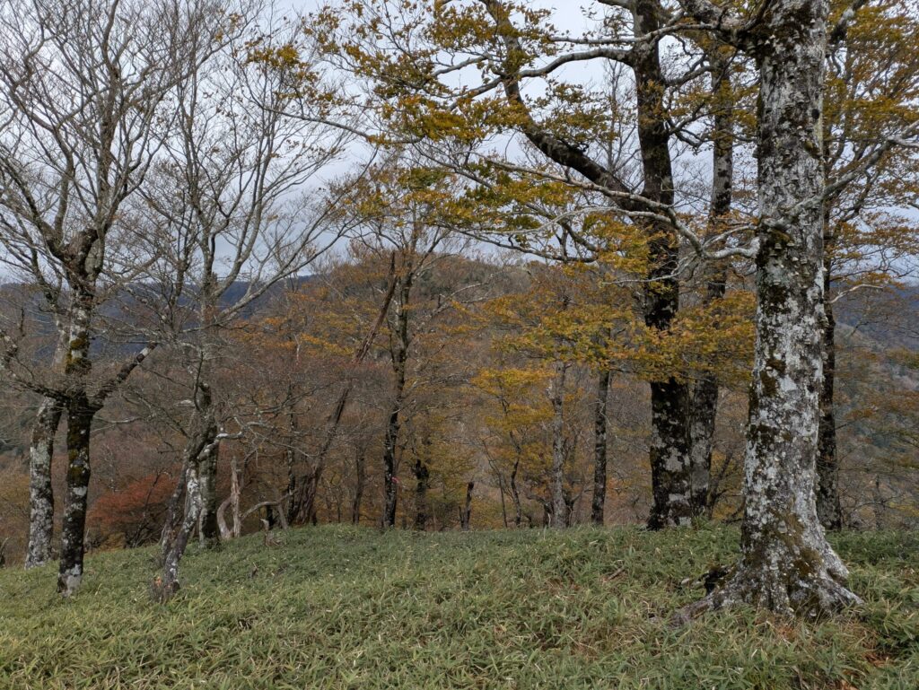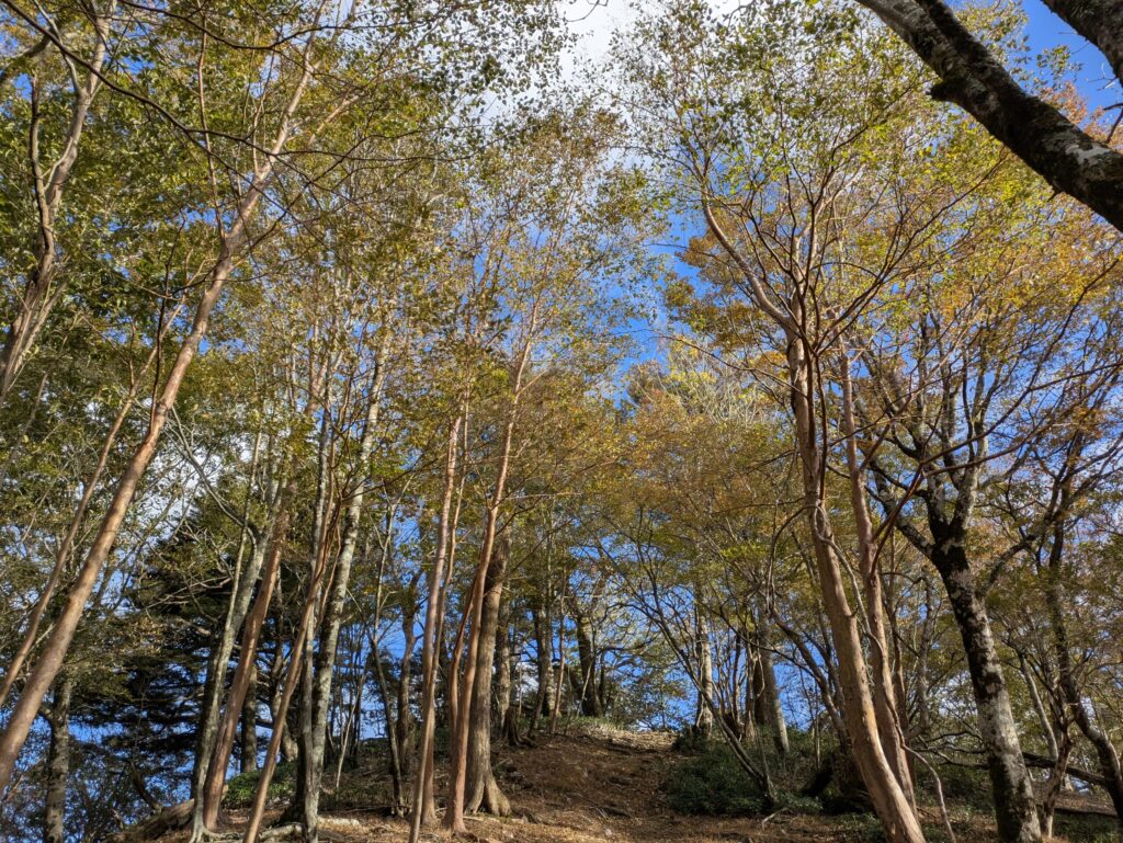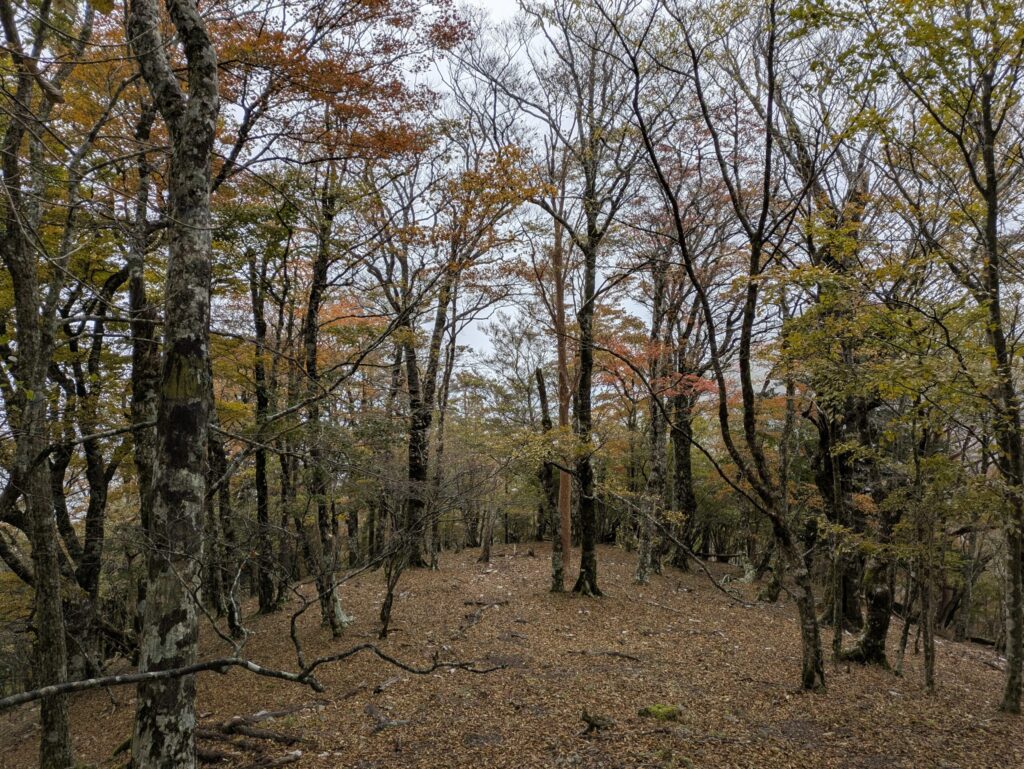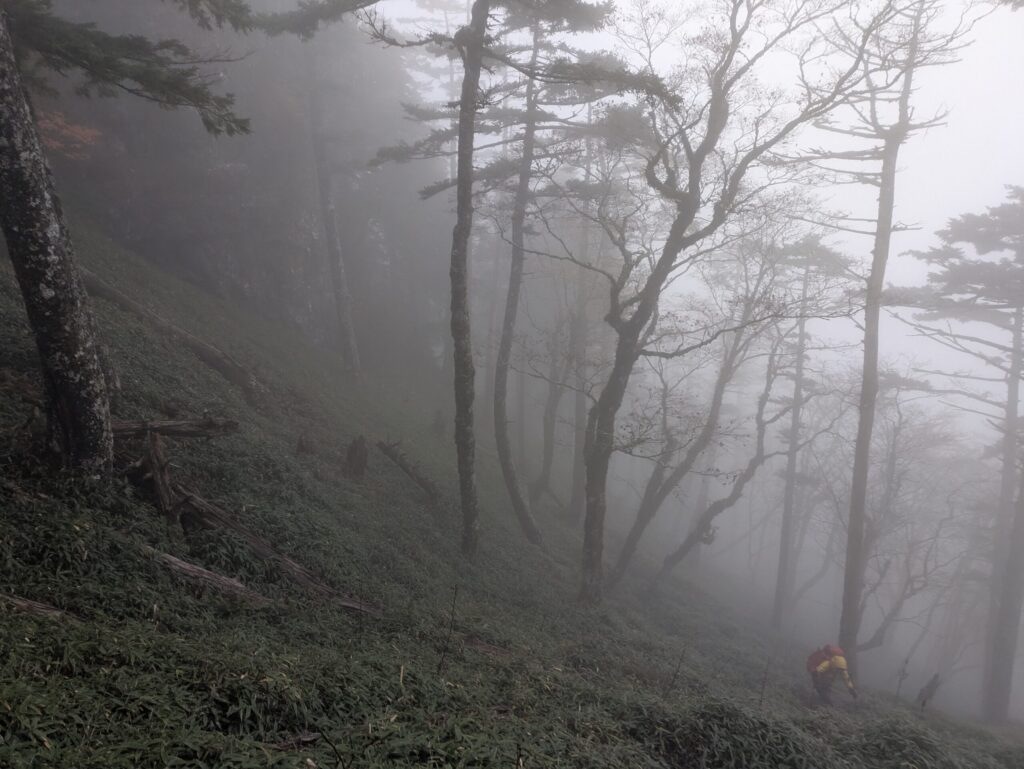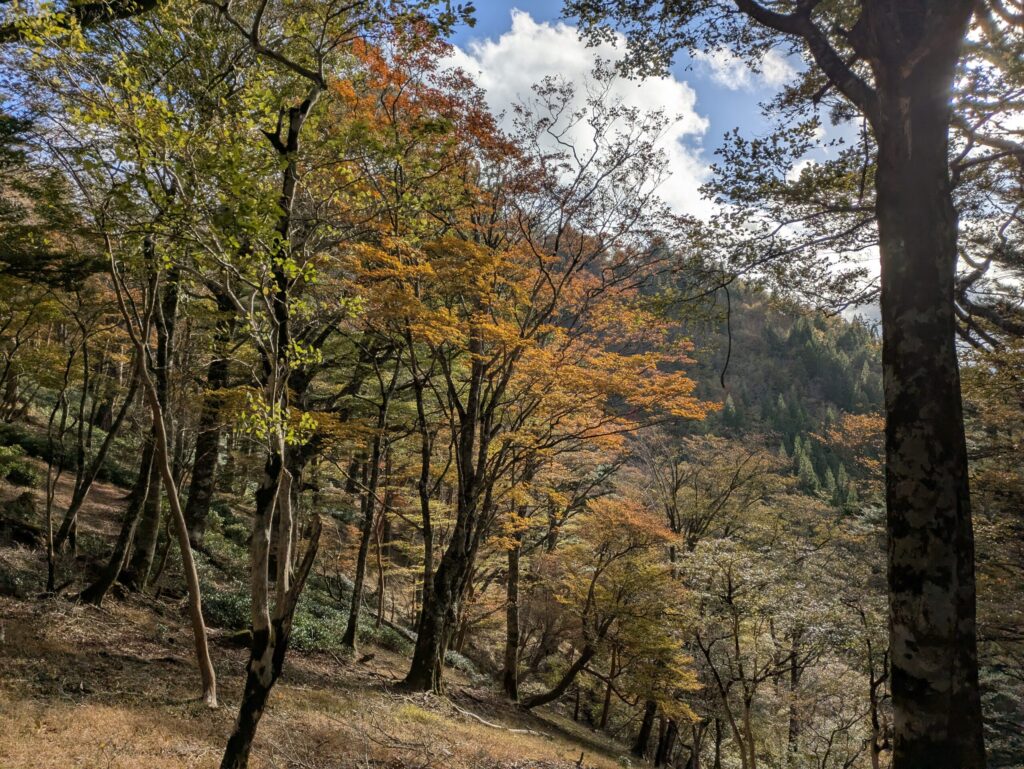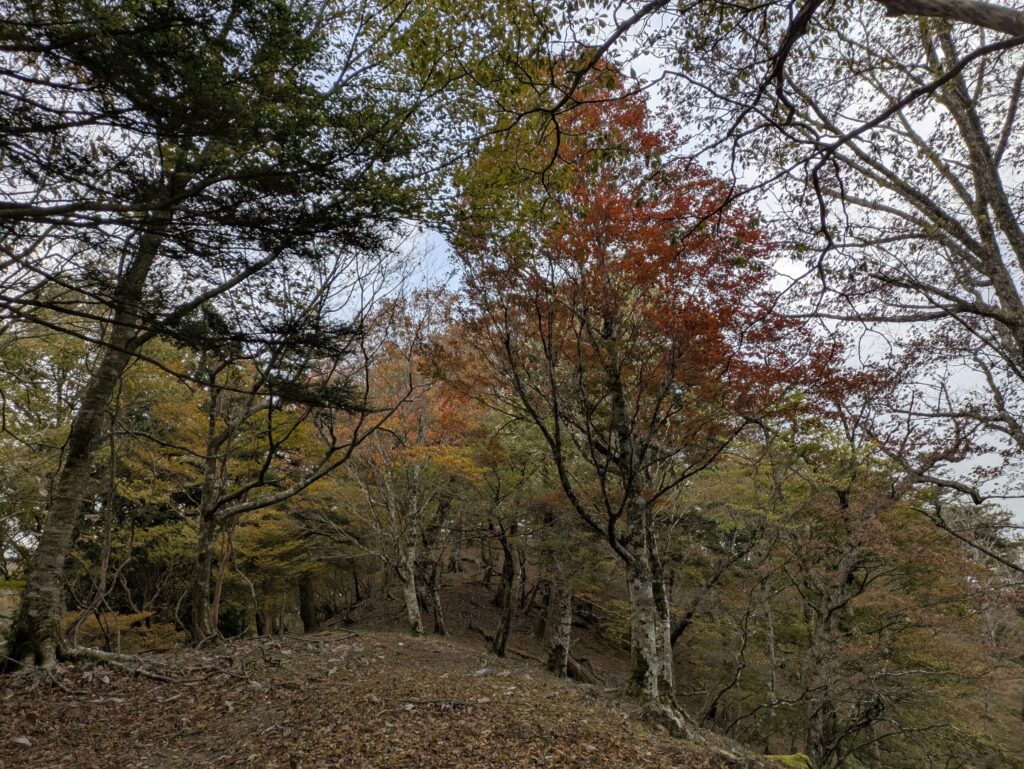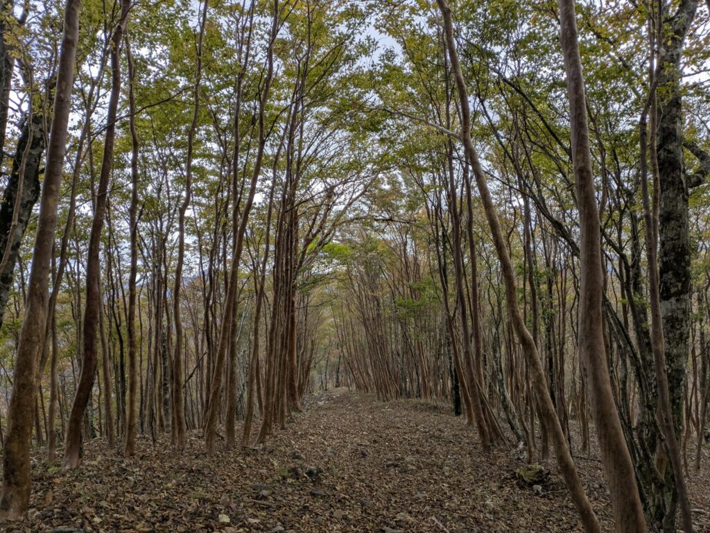 そこから奥駈道を歩いていくと、西斜面は広葉樹・東斜面は針葉樹になる。