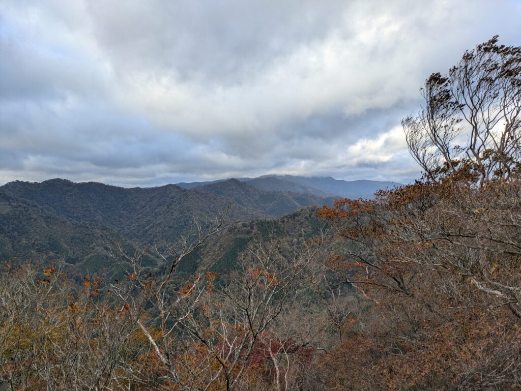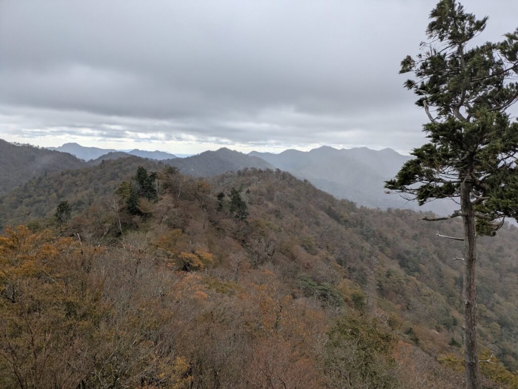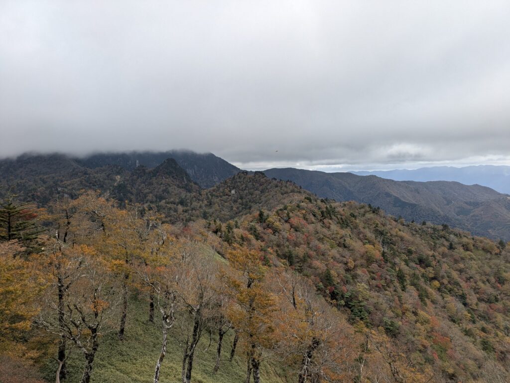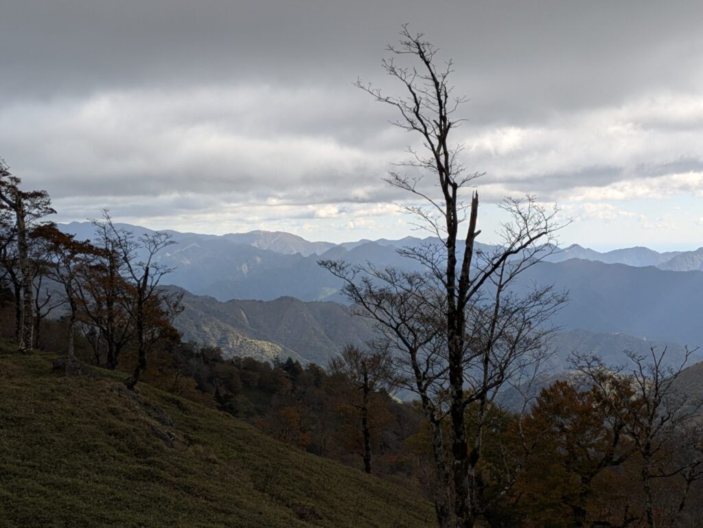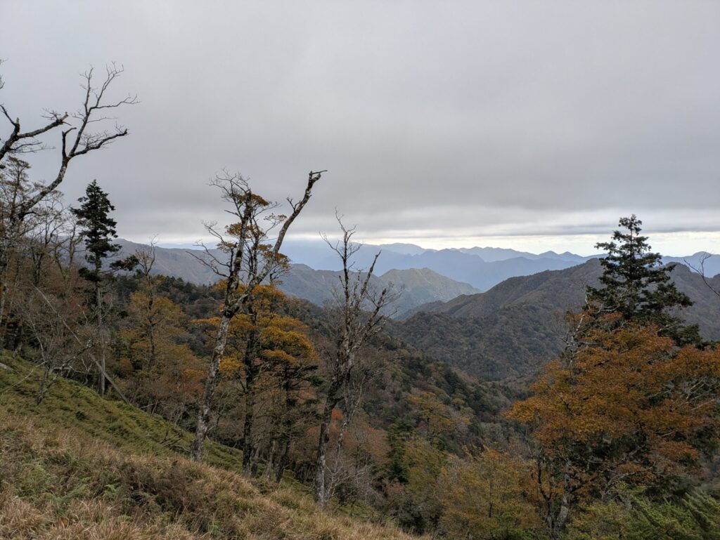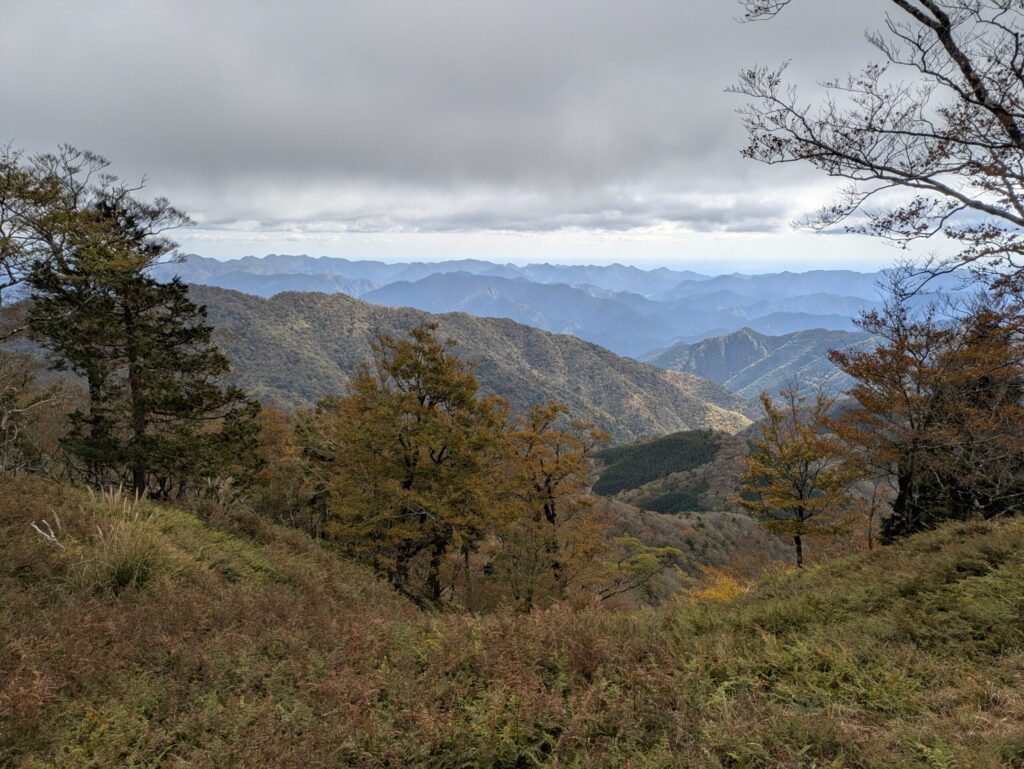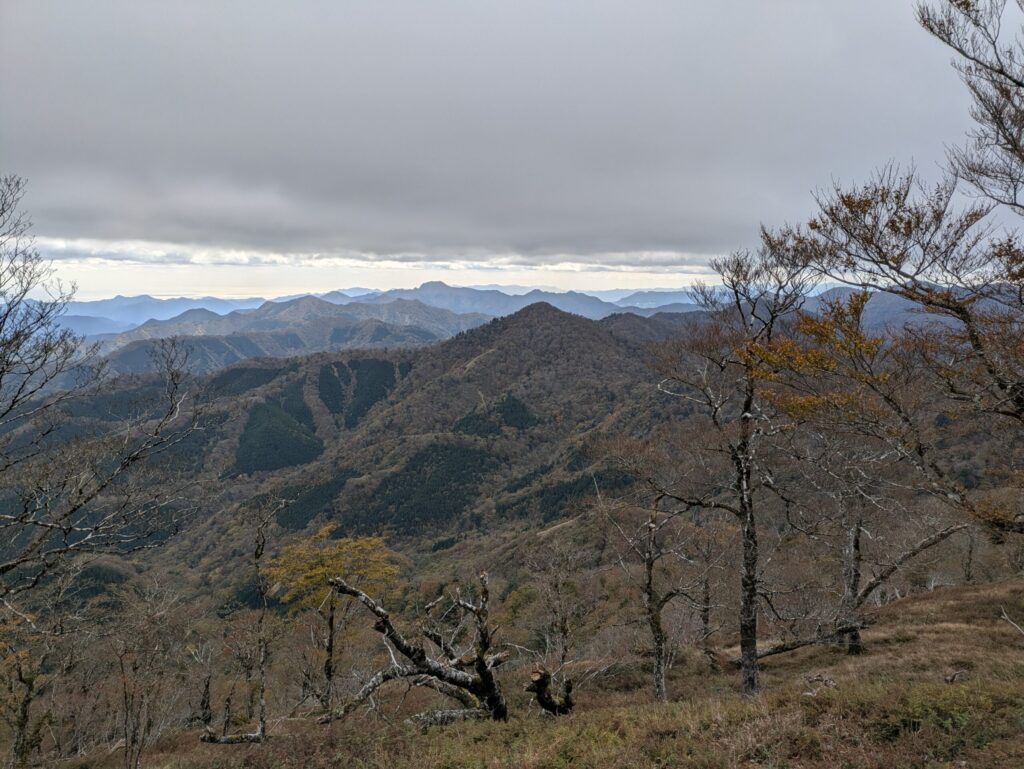 涅槃岳直下より傘捨山、奥には果無山脈を見渡すことできる