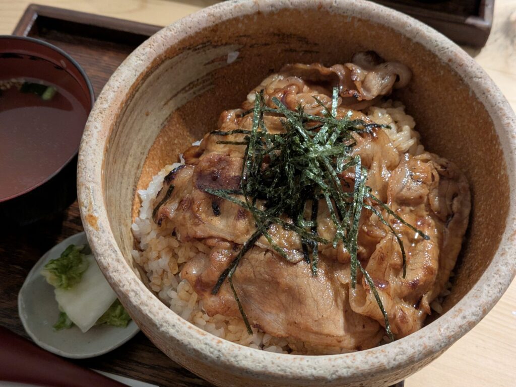 伊賀コシヒカリに、佐多産(鹿児島)の豚肉を炭焼きした。