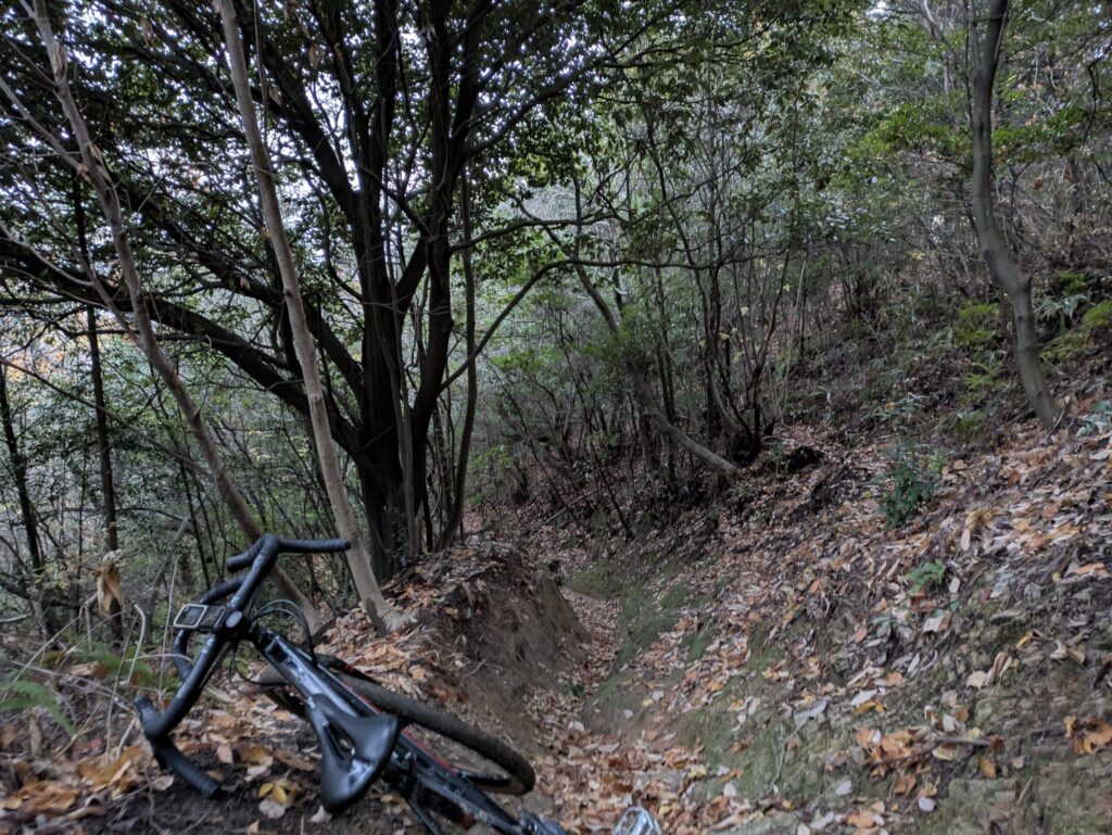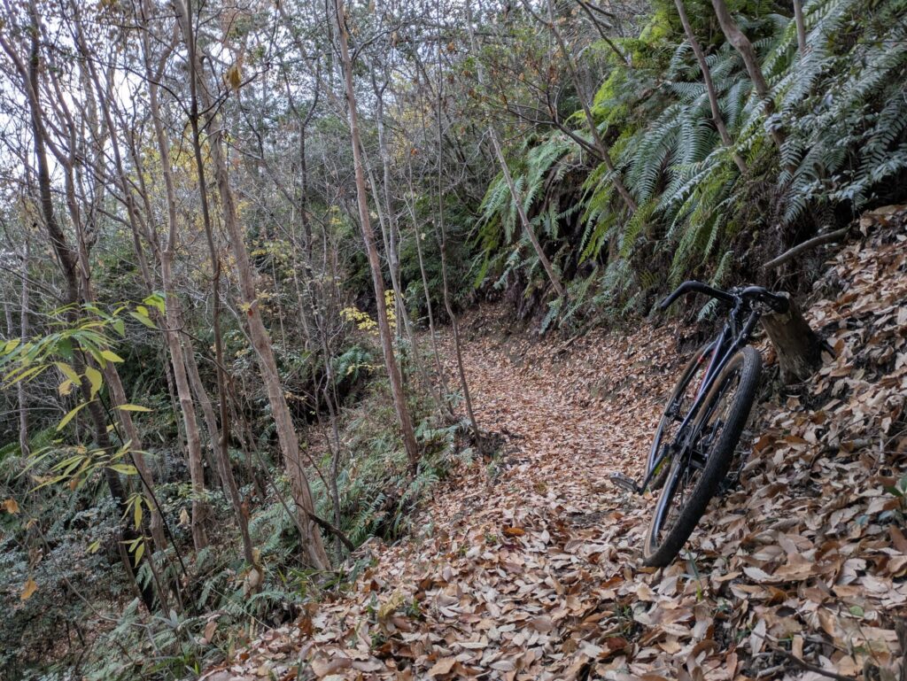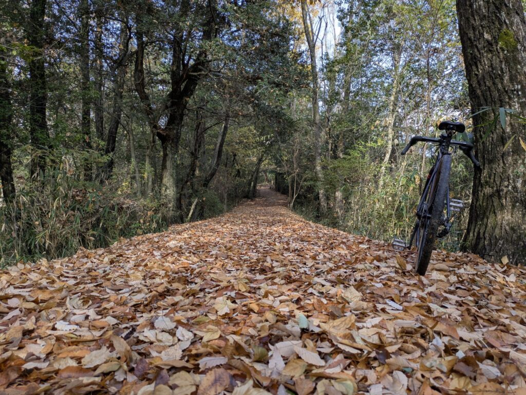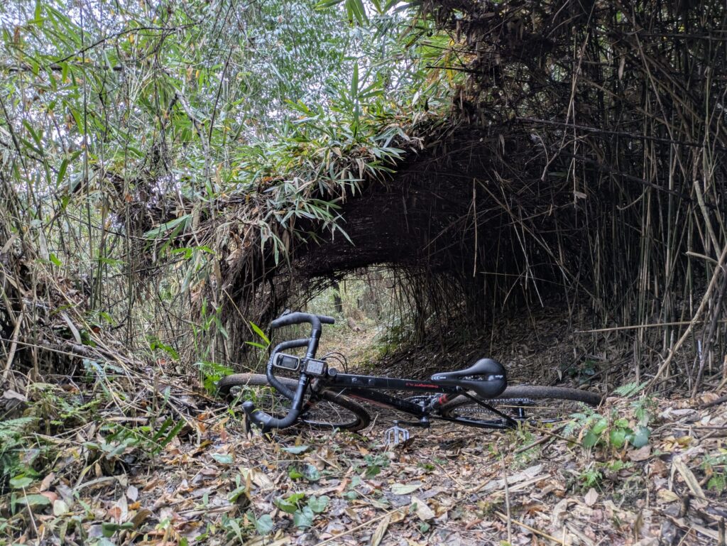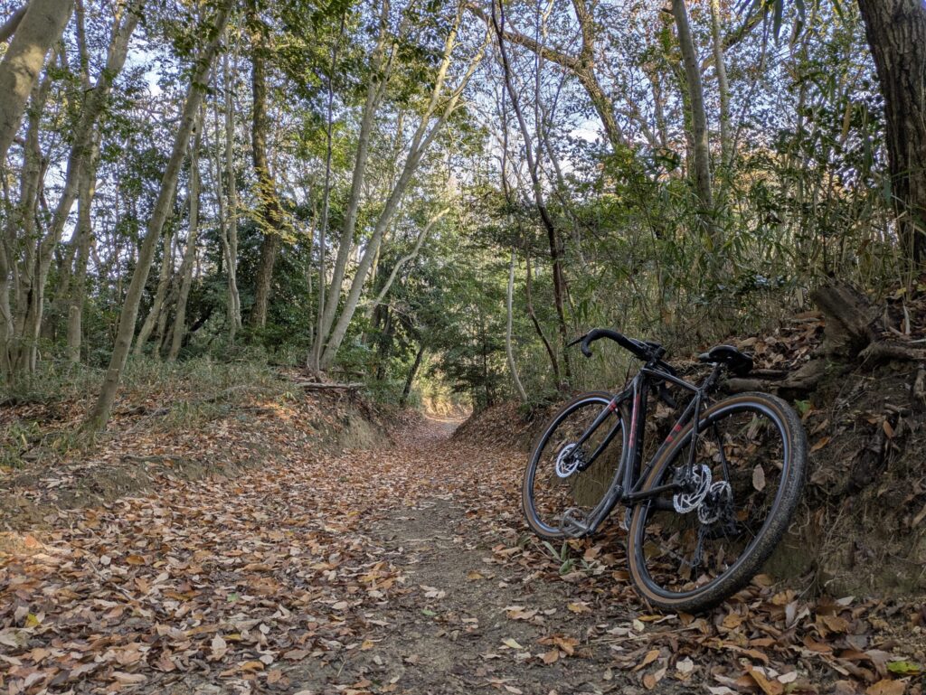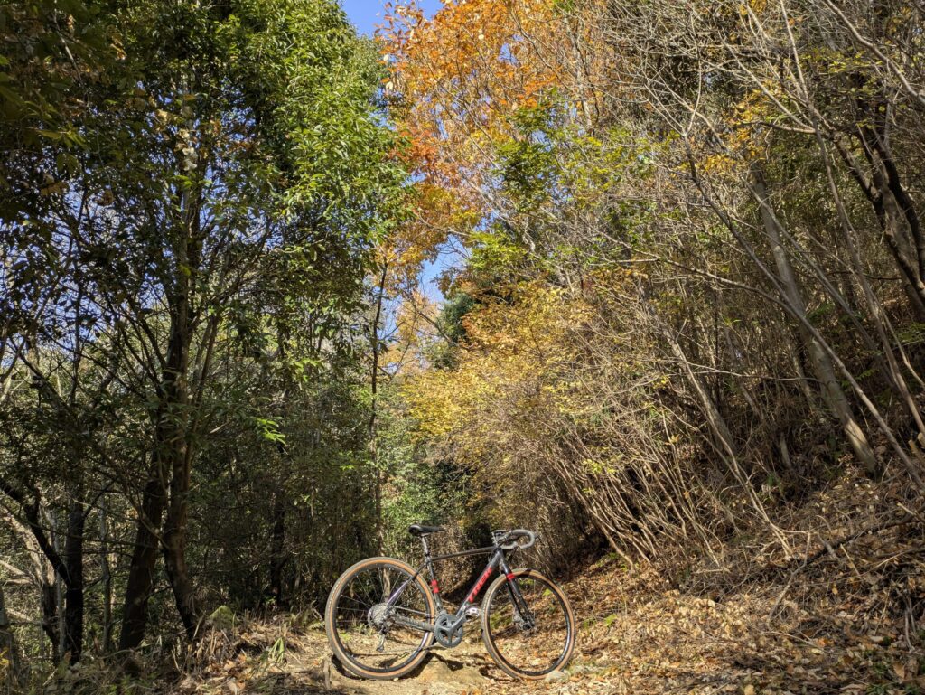 真っ赤なグラベルバイクが、暗い森の中で一際輝いていた。