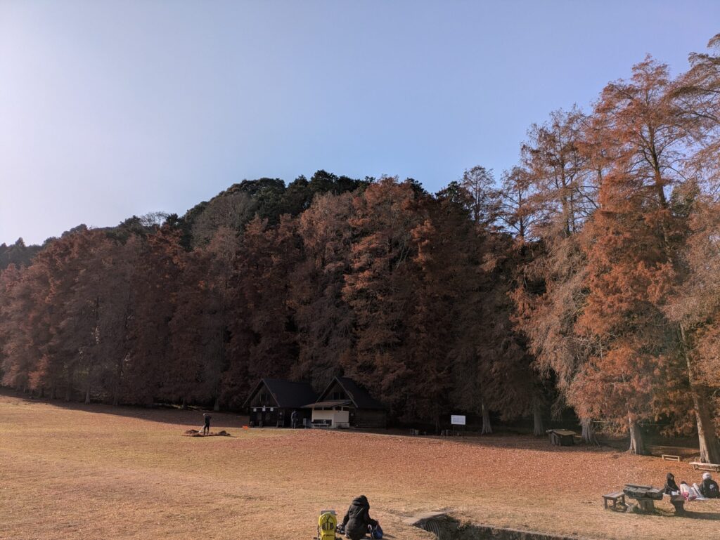 紅葉のメタセコイア並木を前に、座っている家族連れがちらほら居る。