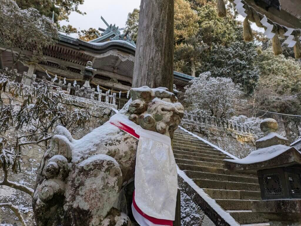 神職さん達が、ブロアーやほうき等で境内の雪を吹き飛ばしていた。