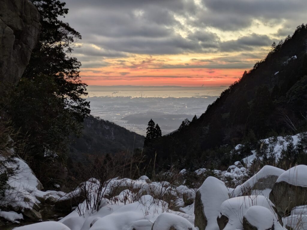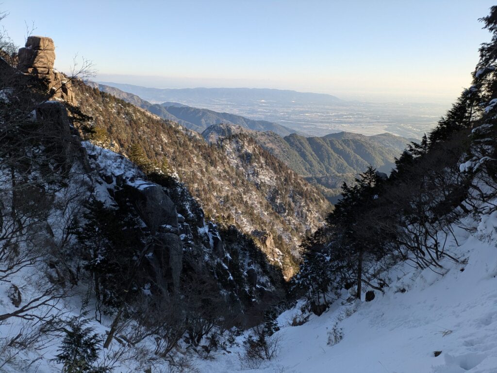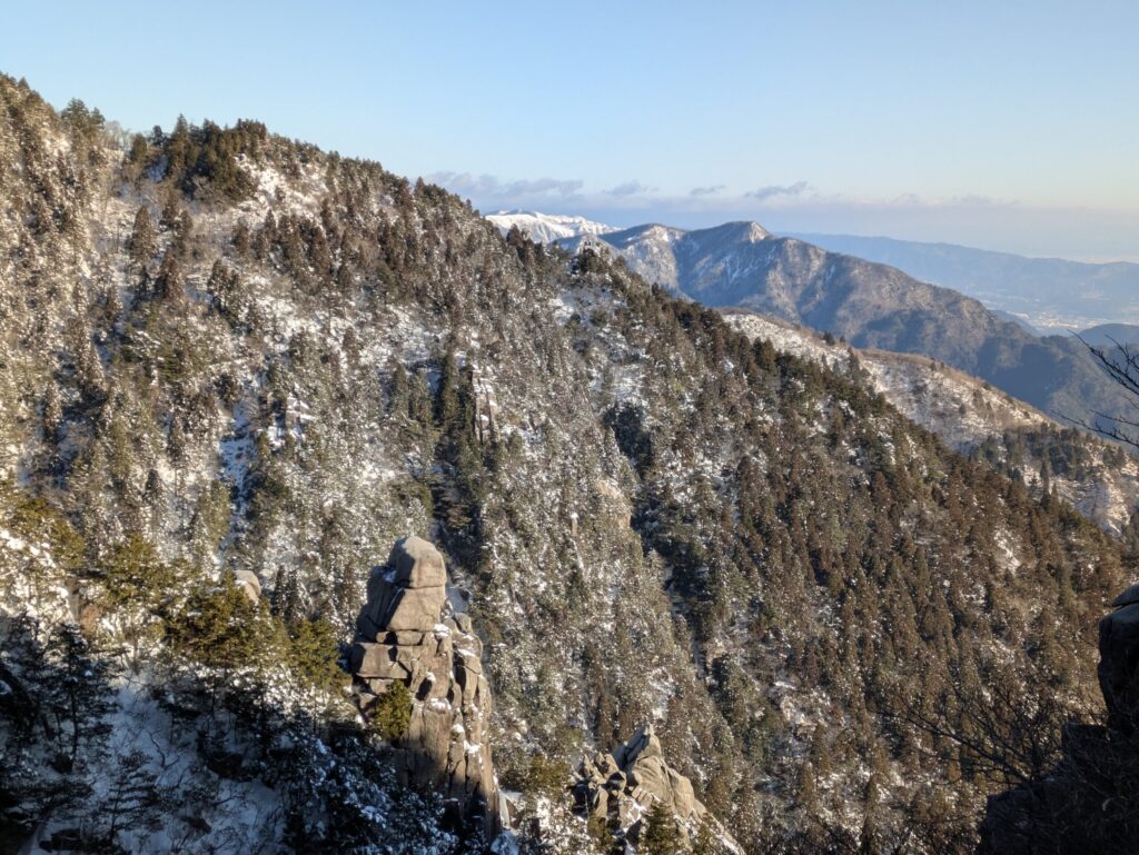 そして振り返ると、養老山地の奥に真っ白に冠雪した御嶽山が見える。