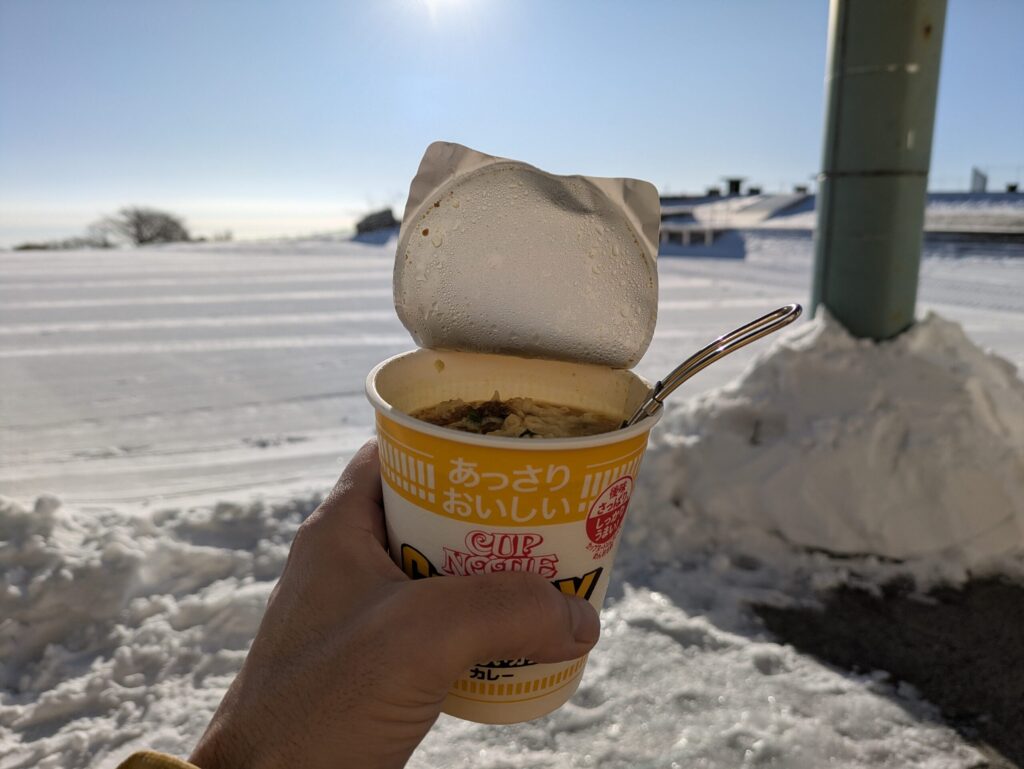 食べてると、スキーインストラクター(黄色モンベルジャケット)の方々が初出勤されてきた。