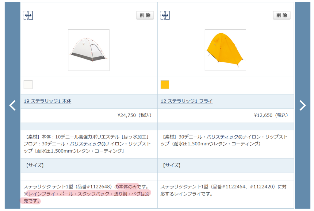 去年までの「ステラリッジテント 本体一式」の商品を、一つ一つ洗い出してみた。