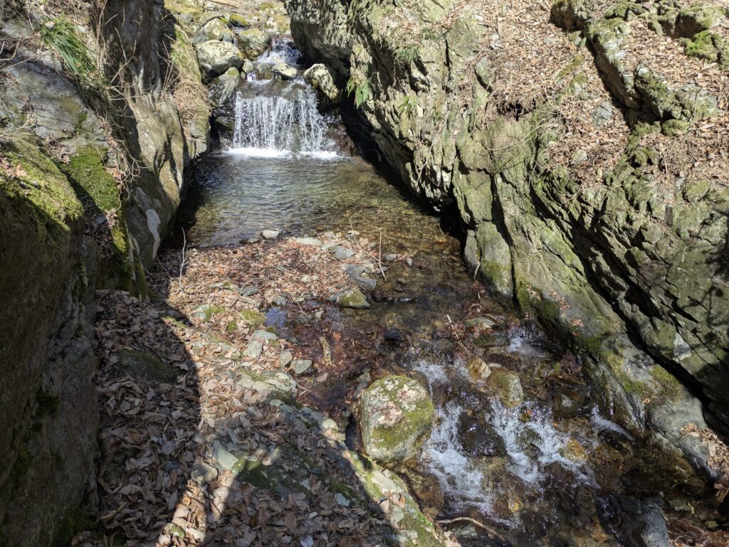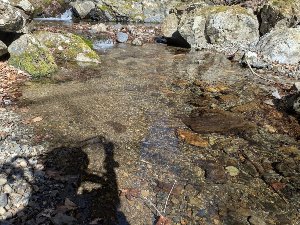 前回雪解け水で増水してて、膝から下全部濡れた。今回は、ふくらはぎ位の水量でほぼ濡れず渡渉できた。