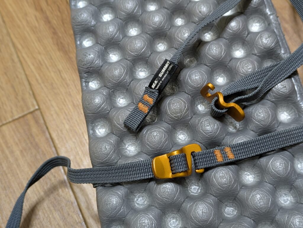 山にマットを持って行く際、丸めて収納やベルトにてパッキングしている。