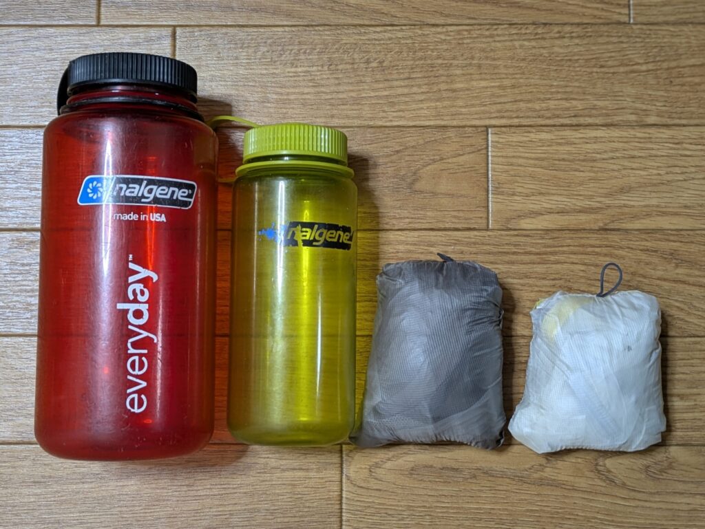 左から、ナルゲン1000ml・500ml・ウインドバイカー・ウインドバイカーベスト